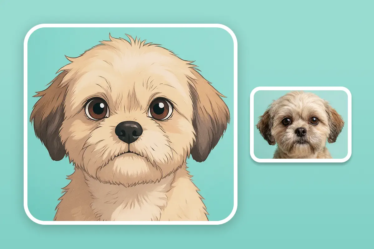 Transform your furry friend into an adorable anime companion. Perfect for custom merchandise, social media content, or unique gifts that celebrate your pet's personality in photo to anime art.